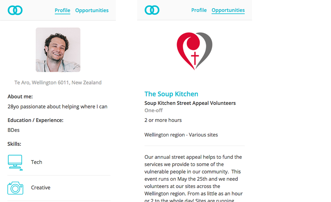 - Volunteers can create an account, view and apply for opportunities by location, which notifies the organisation, and Collaborate can manage opportunities for organisations.